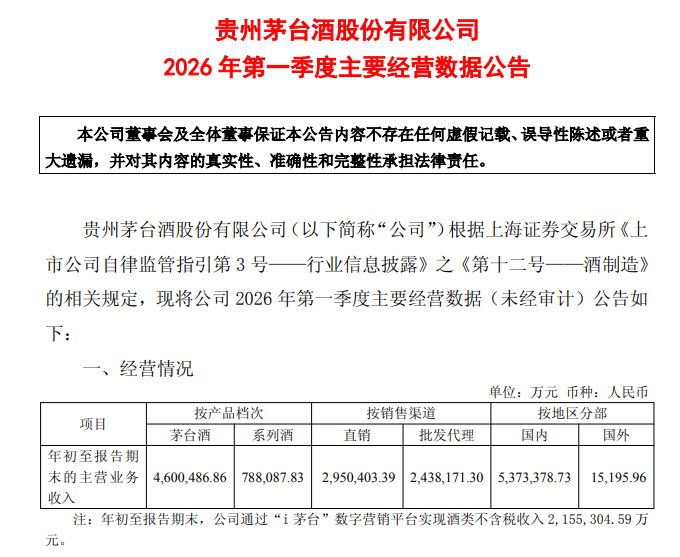 4月24日晚间,贵州茅台发布2026年一季报。一季度,公司实现营业总收入547.03亿元,同比增长6.34%;营业收入为539.09亿元,同比增长6.54%;归母净利润272.43亿元,同比增长1.47%。营收利润均实现双增长,市场化改革成效初显。
